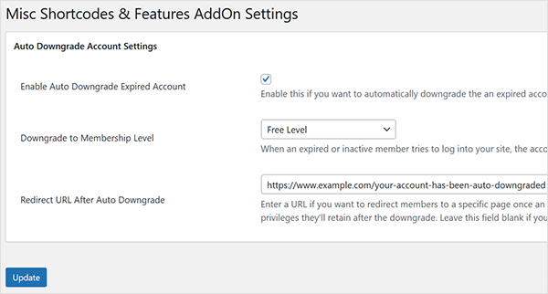 The Misc Shortcodes and Features addon includes a feature that automatically downgrades expired or inactive members’ accounts to a free membership level. This ensures that premium members whose accounts have expired can still log into your site and access content available to free members.
