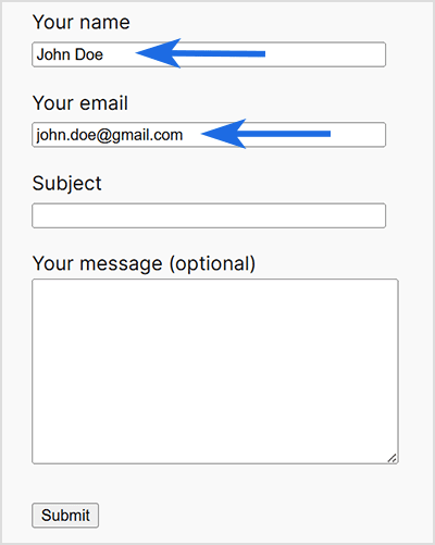 The screenshot below shows an example of a Contact Form 7 form with the name and email fields automatically pre-filled.