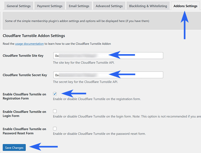 Paste the copied API credentials into the addon’s settings interface. Enable the Cloudflare Turnstile option for your registration form and save the settings.