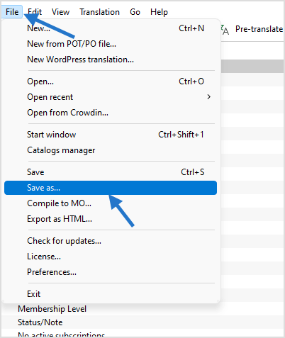 - Open the existing .po file using Poedit (or any translation tool that you are using) and compare it with the main plugin’s POT file (simple-membership.pot).
